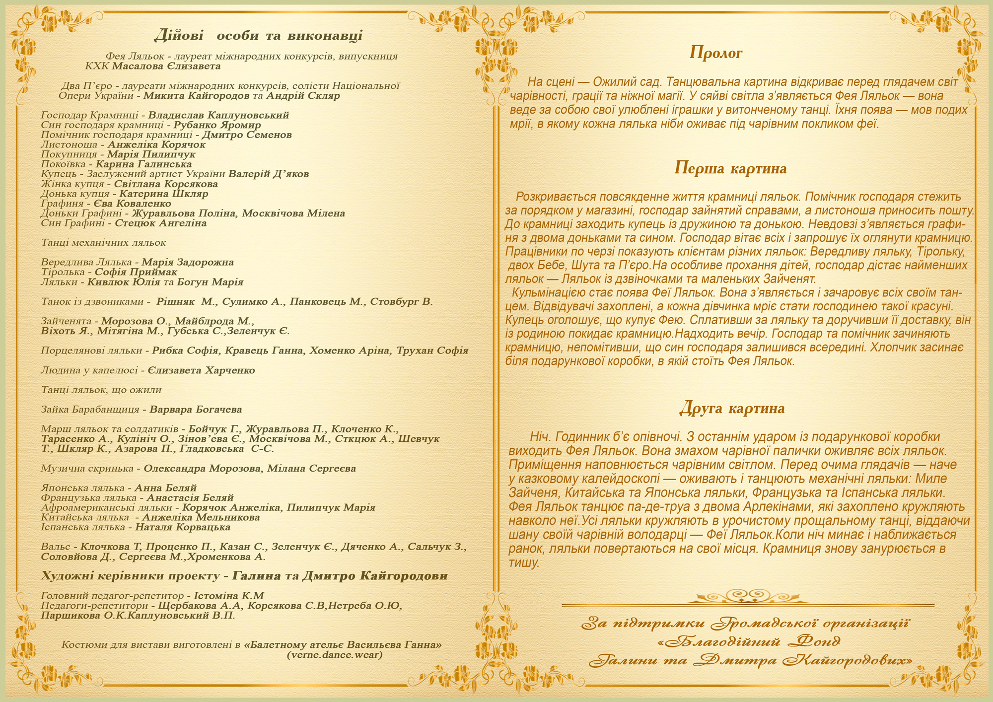 І ось опівночі, з останнім ударом годинника вона виходить зі свого подарункового пакування і помахом чарівної палички оживляє всіх! Приміщення наповнюється чарівним світлом і перед очима глядачів, наче в казковому різнобарвному калейдоскопі, кружляють у танці механічні ляльки, Тіролька, Миле Зайченя в оточенні порцелянових ляльок, східні красуні Китайська та Японські ляльки, витончена Французька лялька і запальна Іспанська! Сама ж Фея Ляльок танцює кокетливе па-де-труа із закоханими в неї двома Арлекінами.