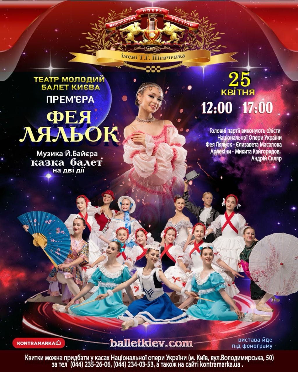 25 квітня 2026 року (о 12.00 та о 17.00) в Національній опері України відбудеться балет «Фея Ляльок» у виконанні театру «Молодий балет Києва».