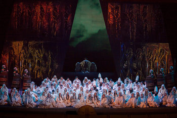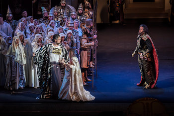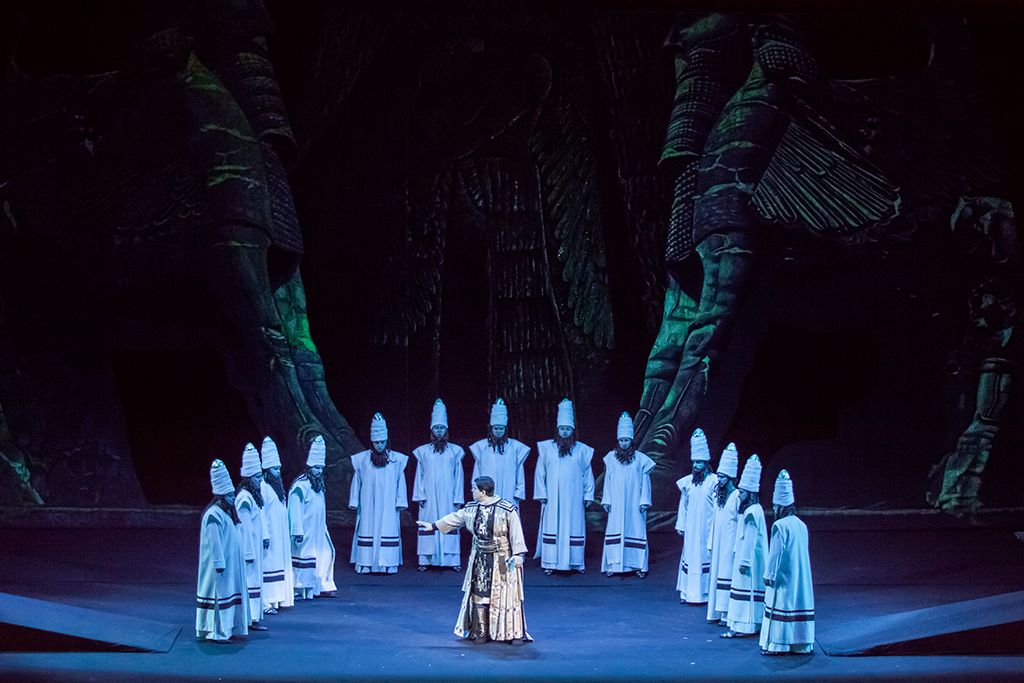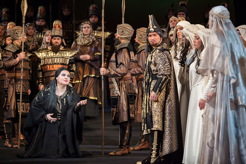 The High Priest of Bel crowns Abigaille. The court nobility glorifies the new Queen. Nabucco enters. Taking advantage of his sickliness, Abigaille tricks him into stamping the decree on punishment by death for the imprisoned Hebrews. For a moment his mind returns to him. He realizes in horror that Fenena should also be punished according to the decree. In front of him, Abigaille breaks the document on her servile origin and proclaims Nabucco to be her prisoner.