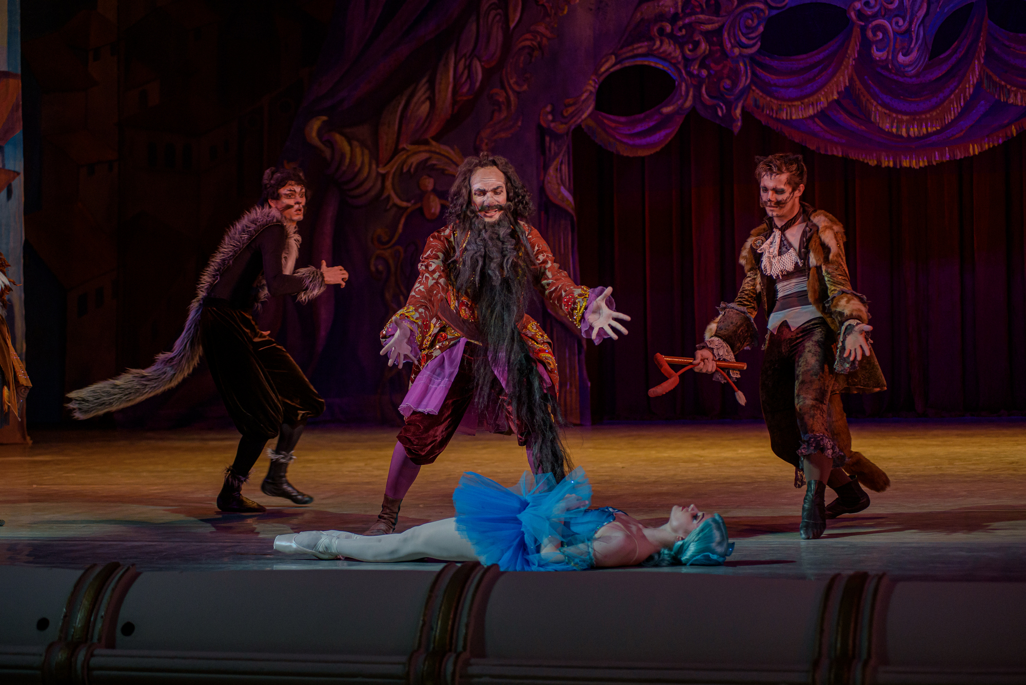 The curtain rises. The performance begins. The owner urges on the tired artists dancing with all their might. The fragile Doll can not hold up to such a rhythm and falls. The performance is disrupted... The owner is furious! The Fox and the Cat carry the broken Doll backstage.