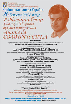 26 вересня у Національній опері україни – ювілейний вечір з нагоди 85-річчя від Дня народження видатного українського оперного співака Анатолія Солов'яненка.